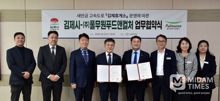 미담타임스 정인화 기자 | 김제시는 27일 ㈜풀무원푸드앤컬처와 '새만금전주간' 고속도로 개통에 따라 새롭게 조성되는‘김제휴게소’운영에 따른 업무협약을 체결했다고 밝혔다.