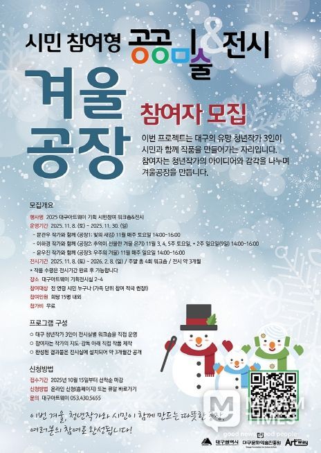 대구문화예술진흥원은 “이번 전시를 통해 시민들이 예술가와 함께 창작의 과정에 참여하며, 겨울의 감성과 상상력을 예술로 나누는 특별한 경험을 하게 되길 바란다”고 밝혔다.