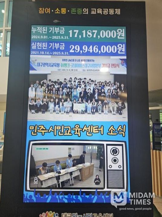 미담타임스 남혜영 기자 | 대구시교육청은 10월 29일 오전 10시에 대구민주시민교육센터 세담홀에서 iM뱅크(은행장 황병우)와 함께 학생들이 민주시민 체험활동을 하며 발생한 기부금 전달식을 개최한다고 밝혔다.