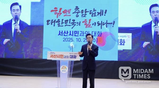 김태흠 충남도지사는 이날 이완섭 서산시장과 함께 시청 중회의실에서 언론인 간담회를 진행한 후 문화회관에서 시민 6백여 명과 지역 발전 방안을 공유했다.