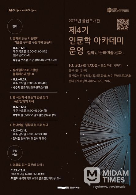 미담타임스 김준완 기자 | 울산도서관은 오는 11월부터 `‘2025년 제4기 인문학 아카데미’를 운영한다고 밝혔다.