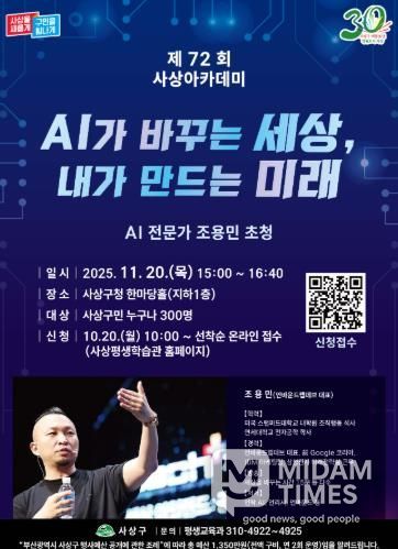 미담타임스 김교환 기자 | 부산 사상구는 오는 11월 20일 오후 3시, 사상구청 한마당홀에서 ‘AI가 바꾸는 세상, 내가 만드는 미래’를 주제로 제72회 사상아카데미를 개최한다.