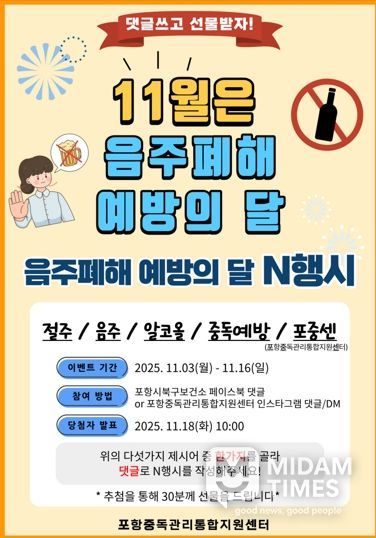 미담타임스 김준완 기자 | 포항중독관리통합지원센터는 11월 ‘음주폐해 예방의 달’을 맞아 지역 주민을 대상으로 중독예방 N행시 온라인 캠페인을 진행한다.