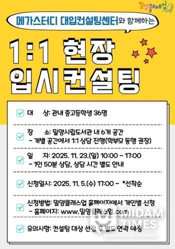 미담타임스 김교환 기자 | 경남 밀양시는 오는 23일 일요일 오전 10시부터 밀양시립도서관에서 ‘메가스터디 대입컨설팅센터와 함께하는 1:1 현장 입시컨설팅’을 개최한다고 3일 밝혔다.