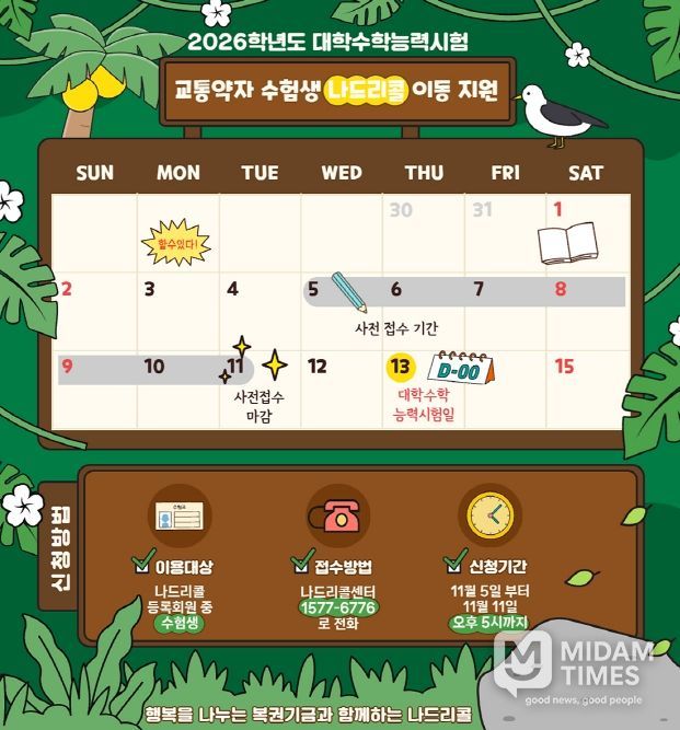 미담타임스 김교환 기자 | 대구공공시설관리공단이 운영하는 교통약자 특별교통수단 나드리콜이 11월 13일 2026학년도 수능을 치르는 교통약자 수험생을 위해 무료 운행을 실시한다.