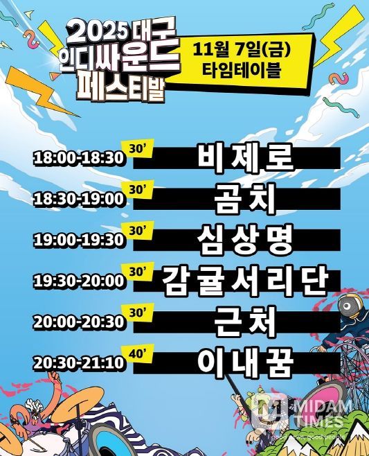 미담타임스 김교환 기자 | 대구광역시는 11월 7일 오후 6시, 11월 8일 오후 3시 이틀 동안 2.28기념중앙공원 중앙무대에서 ‘2025 대구인디싸운드페스티벌’을 개최한다.