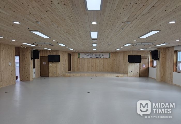그동안 노후화된 벽면과 천장, 바닥으로 인해 이용자 불편이 제기됐던 대강당은 이번 공사에서 국산 친환경 목재를 중심으로 내부 마감과 시설 안전성을 개선했다. 목재 마감은 시각적 쾌적성뿐 아니라 실내 공기질 개선과 정서적 안정에도 긍정적 영향을 주는 것으로 알려져 있어, 지역 어르신들의 이용 만족도 향상과 건강 증진에 기여할 것으로 기대된다.