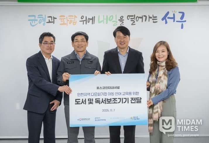 미담타임스 정주환 기자 | 인천 서구는 지난 7일 ㈜포스코인터내셔널로부터 다문화 가정 아동 언어발달을 위한 도서 및 도서기기를 전달받았다.
