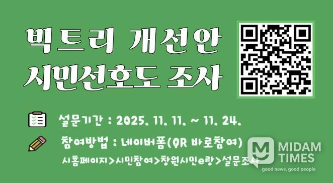 미담타임스 김교환 기자 | 창원특례시는 11월 11일부터 24일까지 2주간 ‘빅트리 개선안 시민 선호도 조사’를 실시한다.