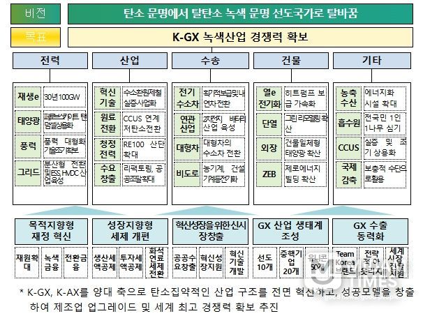 정부는 ‘2035 국가 온실가스 감축목표’ 수립의 후속 조치로 태양광, 풍력, 전력망, 에너지저장장치(ESS), 전기차, 배터리, 히트펌프 등 녹색산업 육성을 위한 세부 추진과제를 담은 ‘대한민국 녹색전환(K-GX, Green Transformation)’을 관계부처, 산업계 등과 함께 내년 상반기까지 수립할 예정이다.