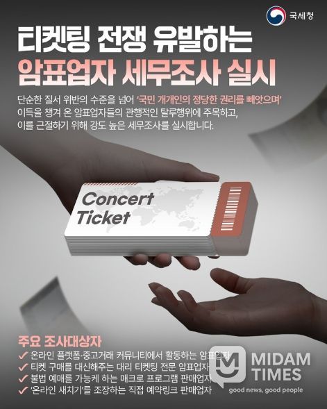 미담타임스 조혜리 기자 | 단순한 질서 위반의 수준을 넘어 '국민 개개인의 정당한 권리를 빼앗으며' 이득을 챙겨 온 암표업자들의 관행적인 탈루행위에 주목하고, 이를 근절하기 위해 강도 높은 세무조사를 실시합니다.