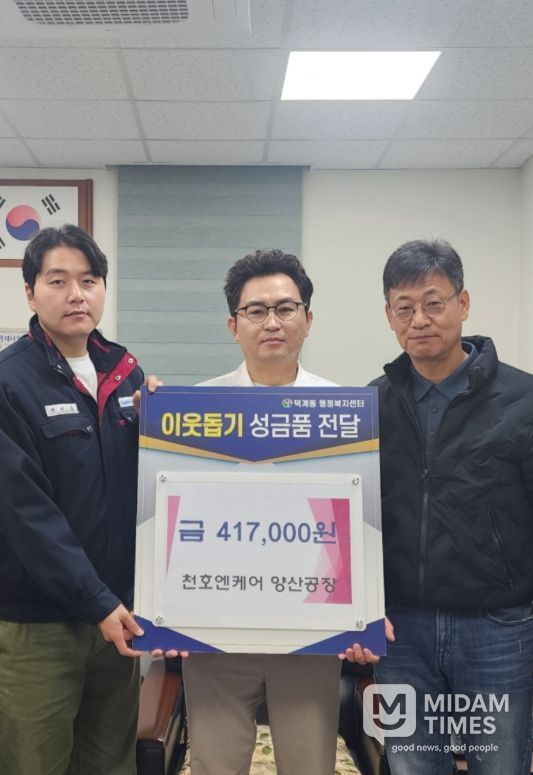 미담타임스 김교환 기자 | 양산시 덕계동은 ㈜천호엔케어 양산공장(공장장 조광보)에서 12일 덕계동행정복지센터(동장 김지욱)를 방문해 어려운 이웃에게 후원해달라며 후원금(417,160원)을 기탁했다고 밝혔다.