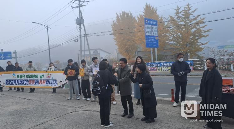 미담타임스 김준완 기자 | 경상북도영양교육지원청은 2025년 11월 13일 오전 7시 10분부터 영양여자중·고등학교 정문에서 2026학년도 대학수학능력시험에 응시하는 수험생을 대상으로 수험생 응원 행사를 진행했다.