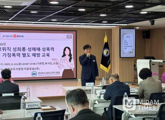 미담타임스 김준완 기자 | 경상북도봉화교육지원청은 2025년 11월 14일, 봉화교육지원청 3층 대회의실에서 초·중·고 교장, 교감, 행정실장 등 고위직 공무원을 대상으로 ‘2025 고위직 대상 맞춤형 폭력예방 통합교육’을 실시했다.