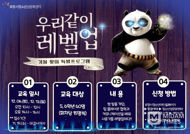 미담타임스 김준완 기자 | 포항시청소년재단은 초등학교 5·6학년 청소년들의 사춘기 적응을 돕기 위해 겨울맞이 특별 성교육 프로그램 ‘우리 같이 레벨업’ 참가자를 모집한다고 18일 밝혔다.