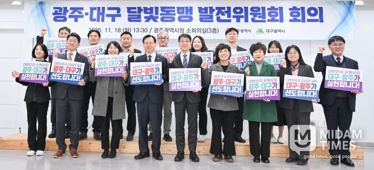 대구광역시와 광주광역시는 11월 18일 오후 1시 30분, 광주시청에서 개최된 ‘2025년 달빛동맹발전위원회’에서 ‘대한민국 AI 3대 강국 선도’ 등의 비전을 담은 퍼포먼스를 통해 협력 의지를 다지며, 달빛철도에 이은 AI 중심의 초광역협력 2.0 시대 개막을 알렸다.