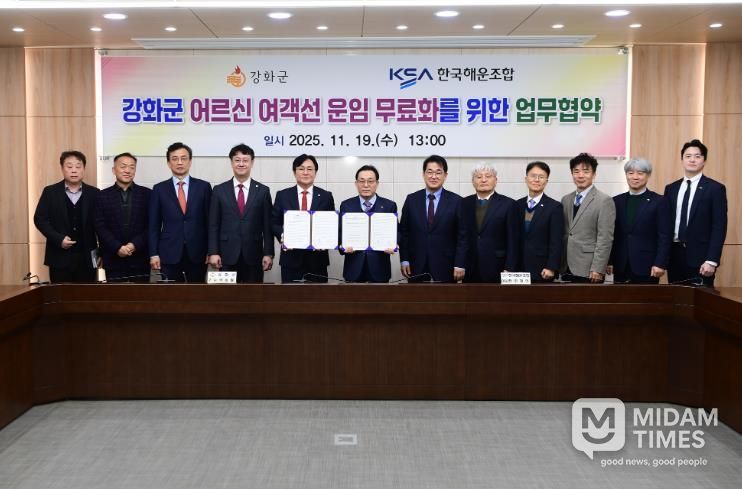 미담타임스 정주환 기자 | 강화군은 지난 19일 한국해운조합과 ‘어르신 여객선 운임 무료화 지원’ 업무협약을 체결하고, 내년 1월부터 사업을 본격 시행한다고 밝혔다.
