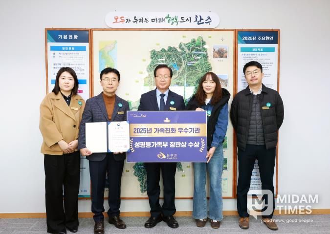 미담타임스 정인화 기자 | 완주군이 지난 20일 한국프레스센터 국제회의장에서 열린 ‘2025년 가족친화 우수기관 유공 정부포상 시상식’에서 성평등가족부장관상을 수상했다.