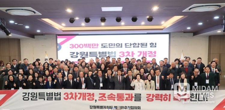 미담타임스 정인화 기자 | 강원특별자치도 범국민추진협의회(협의회장 최양희, 추진단장 김천수)가 11월 21일 11시, 춘천 스카이컨벤션 2층 컨벤션홀에서 강원특별법 3차개정 조속 통과 촉구 결의대회를 개최했다.