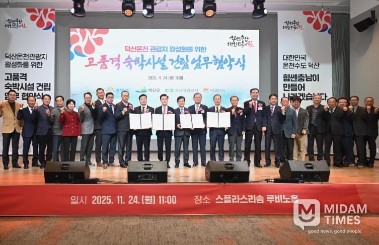 미담타임스 정인화 기자 | 예산군은 24일 충청남도, 충남개발공사, ㈜호반호텔앤리조트와 함께 덕산온천관광지에 고품격 숙박시설 및 컨벤션 기능을 갖춘 복합 휴양시설 건립을 위한 업무협약(MOU)을 체결했다.