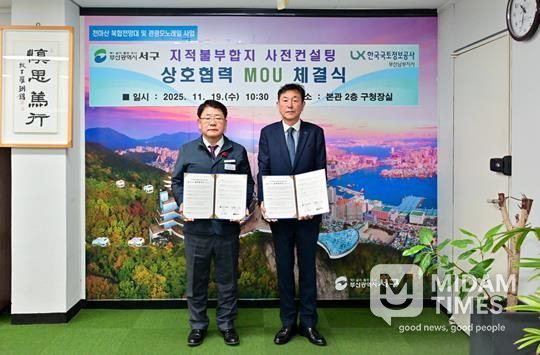 미담타임스 김교환 기자 | 부산 서구는 지난 19일 서구청 본관2층 구청장실에서 한국국토정보공사(LX) 남부지사와‘지역 공공사업 지적업무의 효율적 추진을 위한 지적불부합지 사전컨설팅 업무협약(MOU)’을 체결했다.