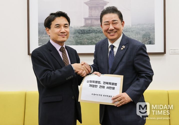 미담타임스 정인화 기자 | 강원특별자치도는 전북특별자치도와 함께 11월 24일 양당 원내대표를 만나 강원·전북특별법 일부개정안의 정기국회 내 조속한 통과를 요청하는 공동 서한문을 전달했다고 밝혔다.