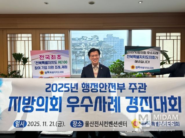미담타임스 정인화 기자 | 전북특별자치도의회가 지난 21일 울산전시컨벤션센터에서 열린 행정안전부 주관 ‘2025년 지방의회 우수사례 경진대회’에서 본선에 진출해 수상하는 영예를 안았다.