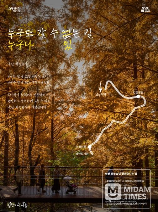 미담타임스 김준완 기자 | 서울시는 10월 25일 개방한 ‘남산 하늘숲길’이 개방한 지 한 달만에 누적 방문객 9만 명을 돌파했다고 밝혔다. 단풍이 절정에 이르는 11월 중순에는 특히 아름다운 경관을 자랑하며, 하루 최대 6,680여 명이 방문하는 새로운 단풍 명소길로 급부상했다.