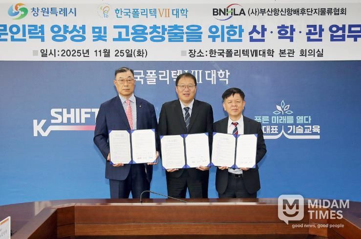 미담타임스 김교환 기자 | 부산항신항과 진해신항 개항으로 항만·물류산업의 급속한 성장에 따라, 25일 한국폴리텍Ⅶ대학 창원캠퍼스에서 ㈔부산항신항배후단지물류협회와 한국폴리텍Ⅶ대학 창원캠퍼스, 창원특례시가 ‘항만·물류 전문 인력 양성을 위한 업무협약(MOU)’을 체결했다.
