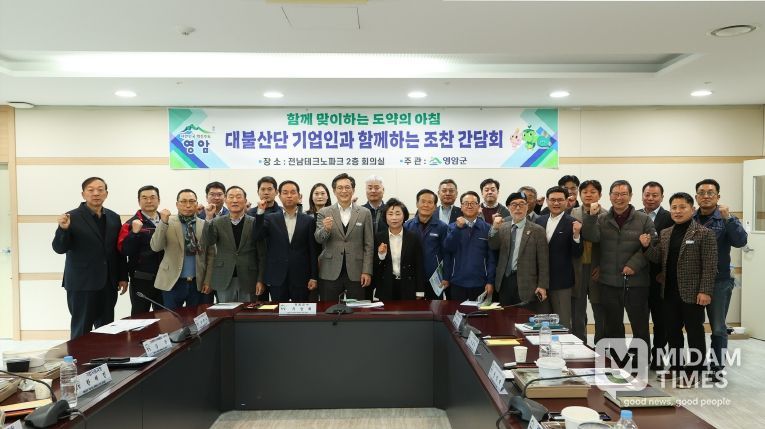미담타임스 김준완 기자 | 영암군이 25일 대불조선해양센터에서 ‘대불산단 기업인과 함께하는 11월 조찬간담회’를 열어 ‘에너지 지산지소(地産地消) 그린시티 100’ 정책 설명하고, 기업 의견을 청취했다.