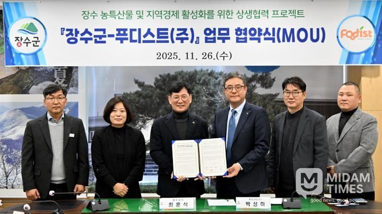 이날 협약식에는 최훈식 장수군수를 비롯해 푸디스트 주요 실무·책임자가 참석해 군 농특산물·레드푸드 판로 확대와 지역 일자리, 축제 홍보, 사회공헌으로 이어지는 다양한 협력 의지를 공유했다.