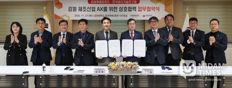 미담타임스 정인화 기자 | 강원특별자치도는 11월 27일 오후 3시, 강원 제조산업의 AX(AI Transformation, 인공지능 전환)를 위한 상호 협력을 강화하기 위해 한국생산기술연구원(원장 이상목)과 업무협약(MOU)을 체결했다.