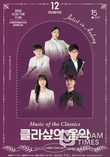 미담타임스 김준완 기자 | 안동문화예술의전당은 지역예술인들에게 다양한 무대 경험을 제공하고, 시민에게는 일상 속 음악 향유할 수 있는 기회를 마련하고자, 매월 첫째 주 화요일 오전 11시에 로비음악회 시리즈를 진행하고 있다. 올해 마지막 로비음악회는 ‘클라샵’의 공연으로 12월 2일 오전 11시, 웅부홀 로비에서 '클라샾의 음악'이라는 제목으로 개최된다.
