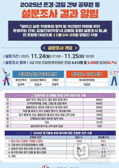 부산 공무원 노조는 11월 24일-25일 양일간‘일하고 싶은 직장문화 정착 및 개선방안 마련을 위한 존경하는 간부, 갑질간부(직장 내 괴롭힘 포함)설문조사 등’을 전 조합원 대상으로 실시했으며 약4,413명 중 2,458명 참여(55.7%) 6급 이하 부산시 공무원들이 이에 응했다.