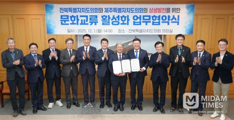 미담타임스 정인화 기자 | 전북특별자치도의회와 제주특별자치도의회는 문화·관광·세계유산 분야 협력을 강화하기 위해 1일 전북도의회 의장실에서 문화교류 활성화 업무협약(MOU)을 체결했다.