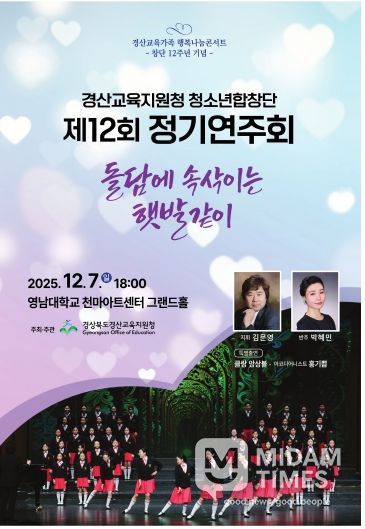 미담타임스 김준완 기자 | 경산교육지원청 청소년합창단은 오는 2025년 12월 7일(일) 영남대학교 천마아트센터에서 ‘제12회 정기연주회’를 개최한다.