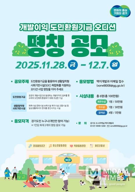 이상우 경기도 택지개발과장은 “이번 명칭 공모는 도민환원기금을 활용한 첫 번째 사업의 상징적인 이름을 도민이 직접 짓는다는 데에 큰 의미가 있다”며 “많은 도민이 참여해 도민이 만드는 도민의 사업으로 출발할 수 있기를 기대한다”고 말했다.