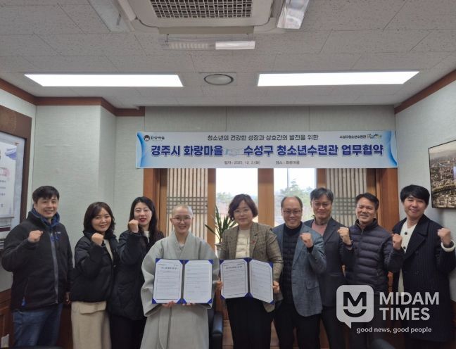 미담타임스 김준완 기자 | 경주시 청소년수련시설 화랑마을과 대구 수성구 청소년수련관은 지난 2일 화랑마을에서 청소년 활동 발전과 상호 협력 강화를 위한 업무협약을 체결했다.