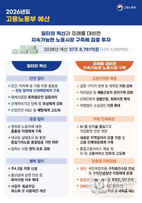 고용노동부는 2026년 예산을 일하는 사람의 생명과 안전을 최우선으로 보호하는 “안전 일터”, 일한 만큼 보상 받고 불합리한 차별이 없는 “공정 일터”, 장시간 근로하지 않고 일·가정 양립이 지켜지는 “행복 일터” 등 국민 삶의 근간이 되는 “일터의 혁신”에 집중 투자할 계획이다. 또한, 취약 노동자에 대한 고용안전망 확충, 인공지능(AI) 등 신기술 중심의 인재 양성, 청년·중장년·장애인의 특성을 고려한 맞춤형 지원 등 미래를 대비한 노동시장 구축에 투자를 확대한다.