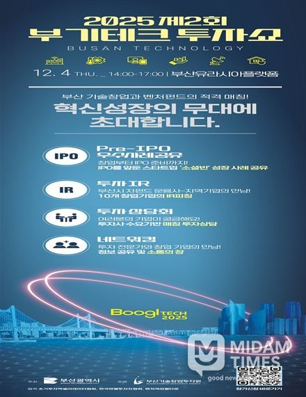미담타임스 김교환 기자 | 부산시는 오늘(4일) 오후 2시 부산역 유라시아플랫폼에서 '2025년 제2회 부기테크 투자쇼'(이하 행사)를 개최한다고 밝혔다.