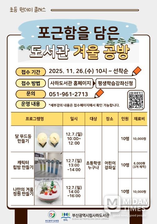 김정남 사하도서관장은 “이번 겨울 공방 원데이 클래스가 어린이들이 창의력을 발휘하고 문화예술 활동의 즐거움을 느끼는 기회가 되길 바란다”고 말했다.