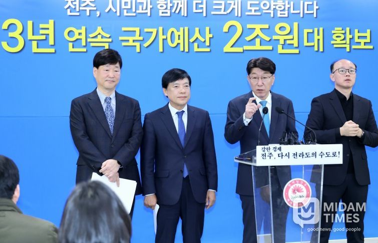 우범기 전주시장과 이성윤 국회의원(더불어민주당, 전주시을)은 4일 시청 4층 대회의실에서 2026년 국가예산 확보 관련 브리핑을 열고, 내년도 국가 예산으로 올해 당초 예산(2조 1595억 원)보다 1340억 원(6.2%) 늘어난 2조 2925억 원을 확보했다고 4일 밝혔다.