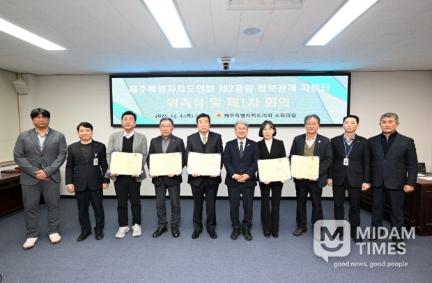 미담타임스 정인화 기자 | 제주특별자치도의회는 12월 4일 오후 2시 30분, 도의회 의사당 소회의실에서 '제주 제2공항 건설사업 정보공개 자문단' 위촉식을 개최하고 제1차 회의를 진행했다. 자문단은 제2공항 건설사업과 관련된 정보를 종합·정리하고, 도민에게 보다 정확하고 쉽게 전달될 수 있도록 조언하는 역할을 맡는다.