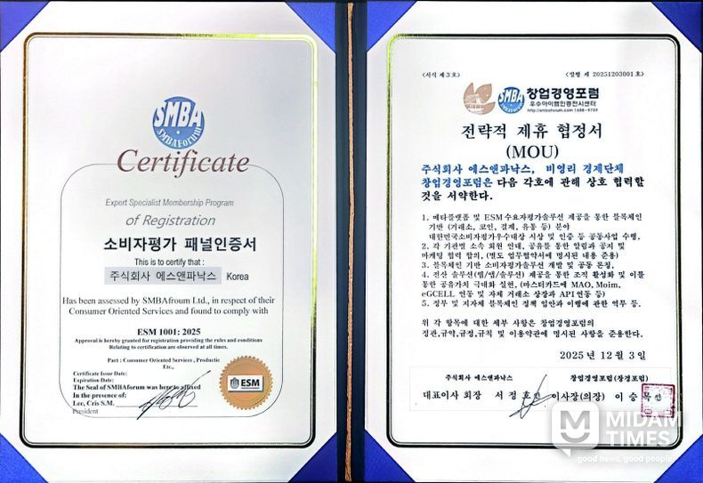 또한 12월3일 .(주)에스앤파낙스(서정호 대표)는 대한민국 소비자평가 단체 창업경영포럼과 전략적제휴 및 우수기업으로 인증 받으며 글로벌 시장으로 발돋움하는 계기를 마련했다.