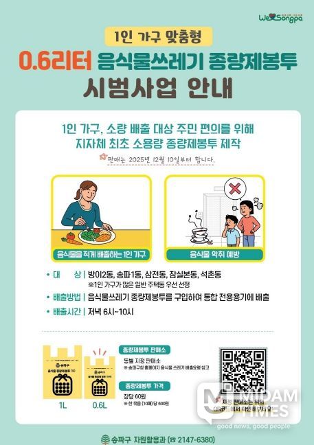 미담타임스 정주환 기자 | 서울 송파구가 전국 지방자치단체 최초로 1인 가구에 최적화된 0.6ℓ 규격의 음식물쓰레기 종량제봉투를 오는 10일부터 시범 도입해 운영한다고 알렸다.