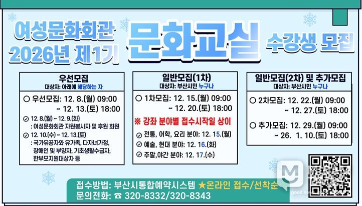 미담타임스 김교환 기자 | 부산시 여성문화회관은 오는 내일(8일)부터 '2026년 제1기 문화교실' 수강생을 모집한다고 밝혔다.