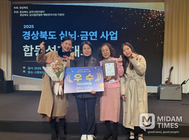미담타임스 김준완 기자 | 경주시보건소는 지난 5일 스탠포드호텔 안동에서 열린 ‘2025년 경상북도 심뇌혈관·금연사업 합동 성과대회’에서 금연지원서비스사업 부문 우수상을 수상했다고 밝혔다.