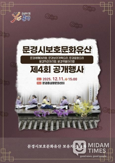 미담타임스 김준완 기자 | 문경시는 오는 11일 문경읍생활문화센터에서 송옥자 문경시 보호문화유산 ‘문경새재아리랑’ 보유자의 네 번째 공개행사를 선보인다.