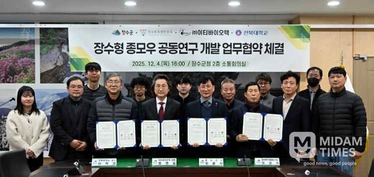 미담타임스 정인화 기자 | 장수군은 장수한우지방공사, 이티바이오텍(주), 전북대학교와 장수군청 회의실에서 장수한우 품질 고급화를 위한 ‘장수형 저탄소 종모우 개발’ 공동연구 상호협력 업무협약(MOU)을 체결했다고 11일 밝혔다.
