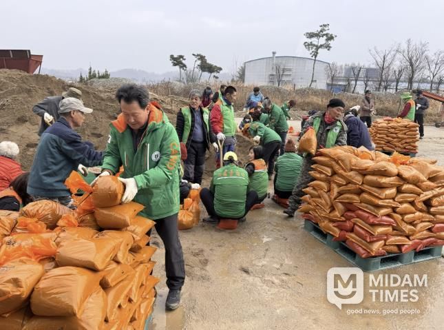미담타임스 김준완 기자 | 문경시 자율방재단은 다가오는 겨울철 폭설·한파로 인한 도로결빙 및 미끄럼 사고를 예방하기 위해 단원 60여 명이 일손을 보태 모래주머니 2,000개를 제작했다.